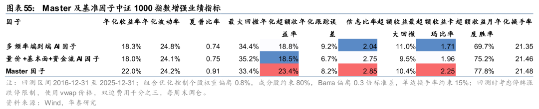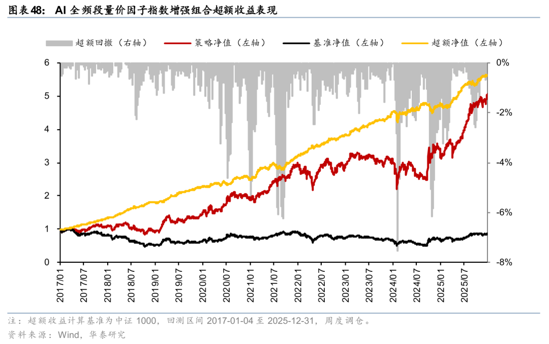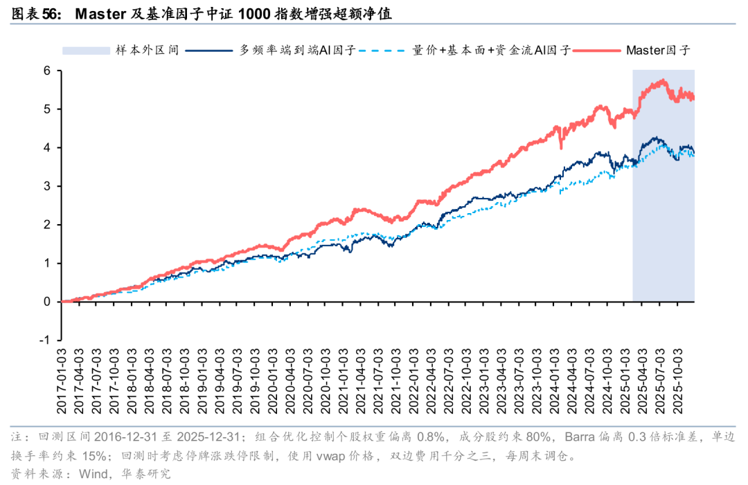基于Master因子构建中证1000指数增强组合,样本外表现可圈可点。自报告发布后至2025年7月底超额趋势较强,累计获超16%超额,但其后AI因子普遍回撤的背景下组合超额收益也有所下滑,截至2025年底累计获取8.4%超额收益,与多频率端到端AI因子7.0%超额收益、量价+基本面+资金流AI因子7.7%超额收益相比仍稳定占优。