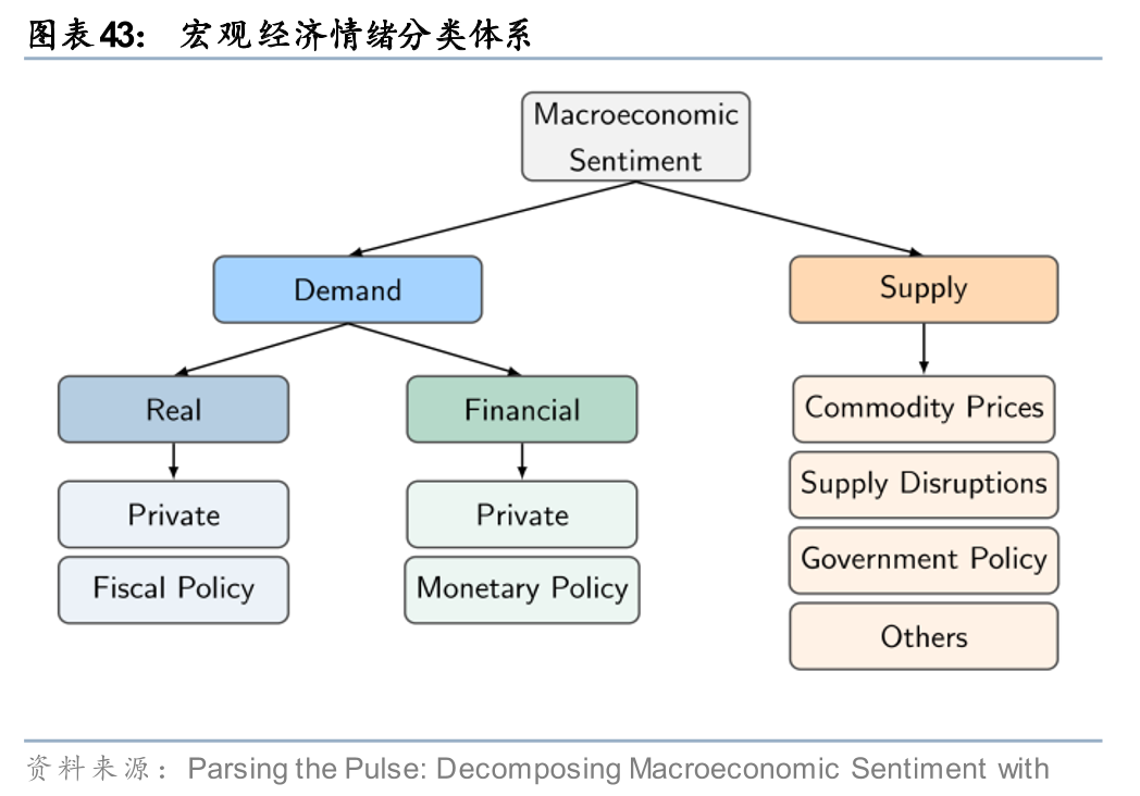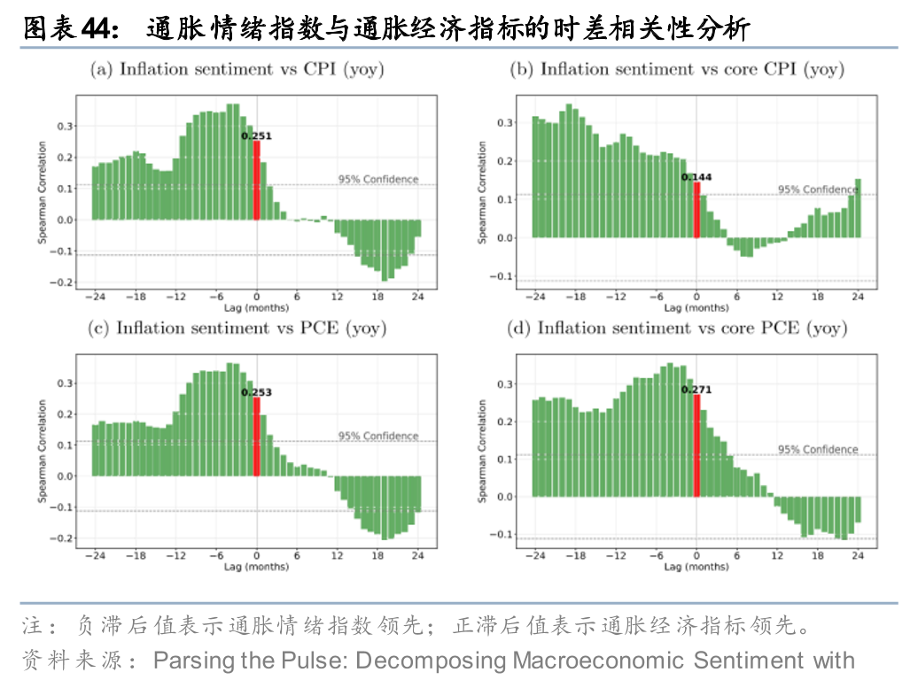 学界和业界对“叙事建模”的尝试已从关键词匹配、主题模型等简单文本分析方法转向了基于LLM的深度逻辑挖掘,并用于宏观监测和资产定价等领域。宏观监测方面,国际清算银行(BIS,2025)运用LLM对财经新闻进行多层级分类与打分,构建出基于底层驱动因素的子指数,并汇总为需求、供给及总体情绪指数。该情绪指数与实际经济指标相关性高,且具备领先性,可作为高频实时监测工具。例如,通胀情绪指数能紧密跟踪CPI、PCE等实际通胀变化,对核心通胀率的预测表现突出,并在疫情后通胀大幅上涨前已发出早期预警。