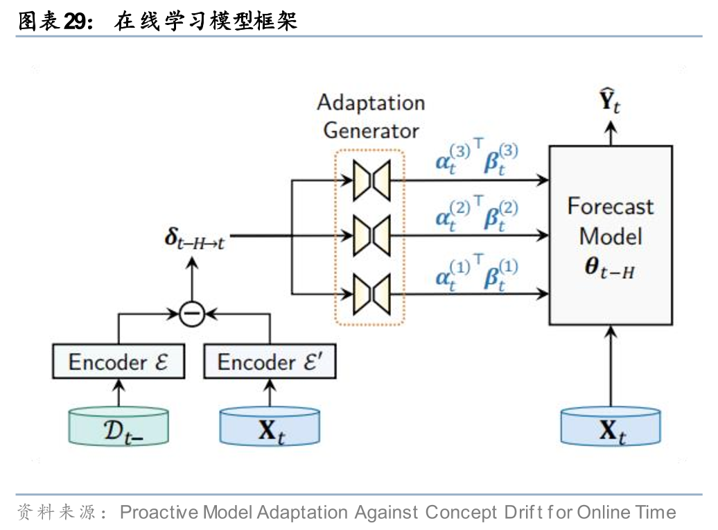 思路三:提升模型迭代速度。静态的模型无法学习动态的市场,因此提升模型泛化性更直接的思路是提升模型的迭代速度,在线学习、元学习或强化学习等训练技巧均起到类似效果。以Zhao和Shen(2024)对Online Time Series Forecasting的研究为例,其提出的在线学习框架通过一组编码器对时序数据分布的偏移进行建模,并将其映射至模型权重空间,从而实现在推理时根据数据集分布变化在线调整模型权重。