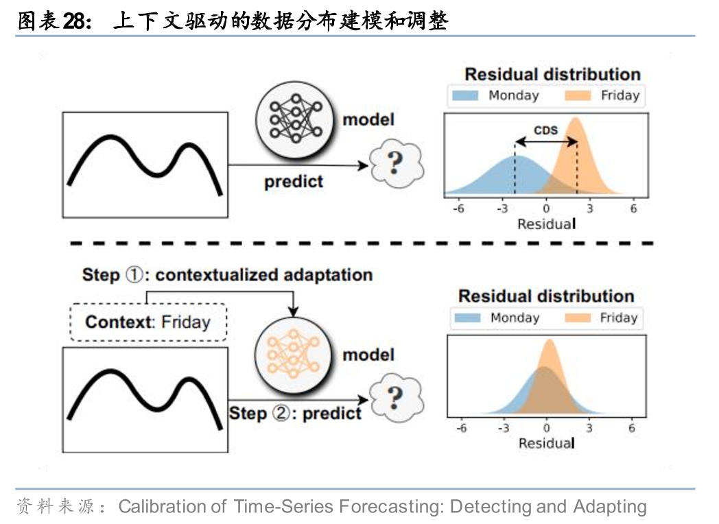 思路二:引入先验信息,建模和预测市场环境变化。除了被动的适应数据分布的变化,另一个思路是对数据的变化进行主动的建模和预测。以Chen等(2024)的模型为例,其假设时序数据分布受某些上下文语境的影响,例如周一和周五的数据分布存在某种潜在的差异。因此其为模型引入了一个前置模块,专对特定上下文语境下的数据分布进行建模,在该模块的帮助下,预测模块工作时即可根据特定语境自适应调整。股票市场同样存在各种各样的“上下文语境”,如宏观周期、日历效应等,该研究中基于上下文的数据分布建模方式或许对于金融市场的时序分域建模有一定启发。