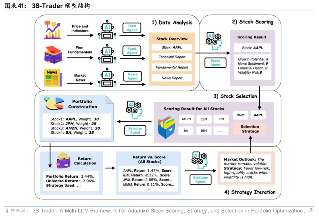 除了强化学习,近年来大型语言模型(LLM)在投资组合优化中也展现出独特优势。相比传统方法,它们能够直接处理多模态金融数据,整合价格走势、财务指标和市场资讯,实现跨资产的全面分析,从而在组合构建中更好地解决信息异质性、跨期依赖以及多维风险权衡等问题。Chen等人(2025)提出的3S-Trader模型,通过多个 LLM 代理分别分析新闻、财报和技术指标,对每只股票生成多维评分,再结合策略迭代模块进行组合构建与调整。3S-Trader 的设计展示了 LLM 在投资组合端到端建模中的潜力:不仅能够整合多源信息,还能提供可解释的策略优化方向。尽管该模型暂未直接对LLM基座开展训练微调,但这一多智能体协作的框架思路,为后续训练LLM基座,直接输出投资组合权重并平衡风险与收益,提供了一定的思路指引。