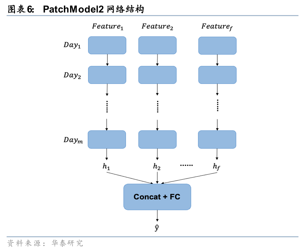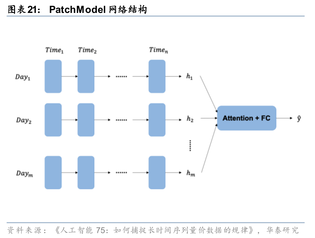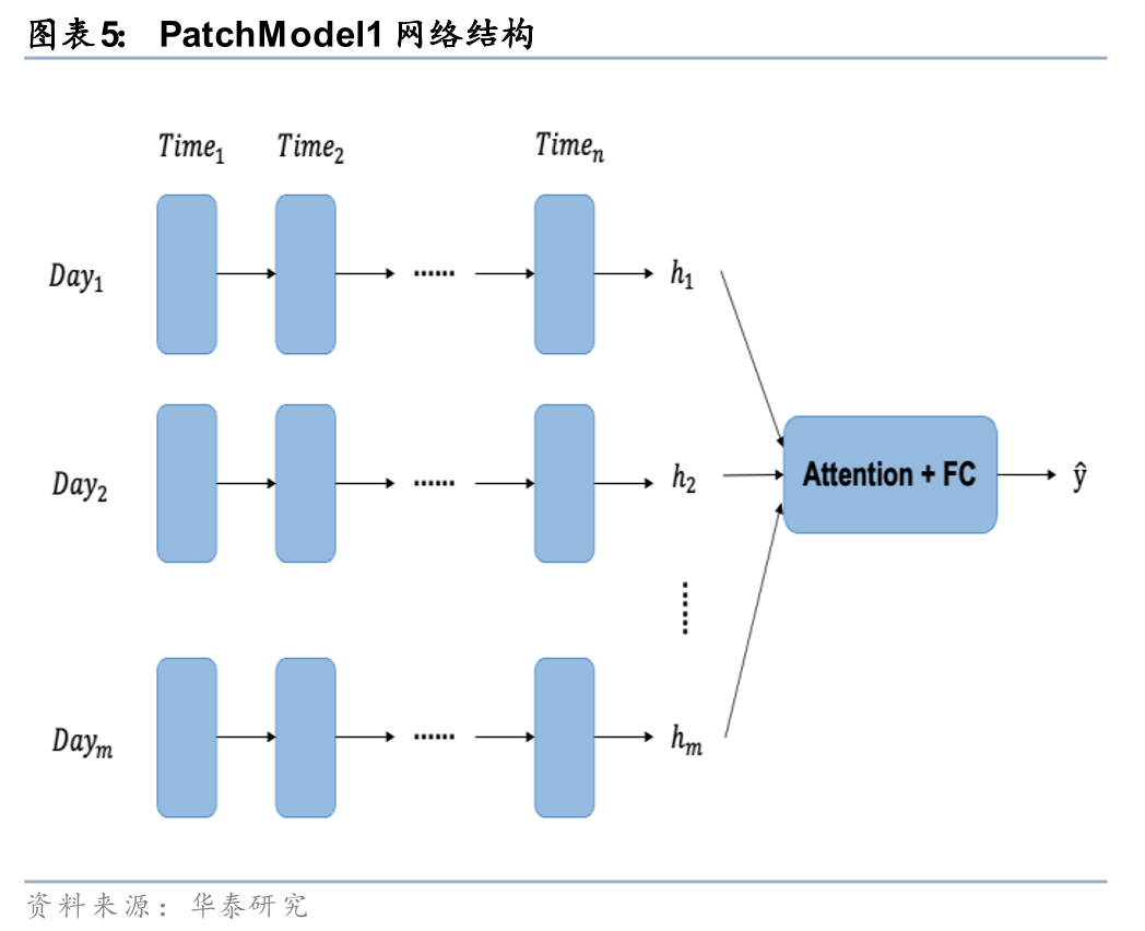 在《人工智能75:如何捕捉长时间序列量价数据的规律》(20240314)中,我们借鉴分块思想对GRU模型加以改造。按照交易日将股票的长时间序列量价数据划分为多个patch,使模型可以有效缓解信息遗忘的问题,并引入以日为周期的先验知识,差异化地分析日内和日间信息传递。PatchModel1使用GRU处理日内的时序数据,再通过注意力机制构建日间的联系;PatchModel2将日内时点信息拆解为不同的特征,再使用GRU来挖掘日间的时序规律。