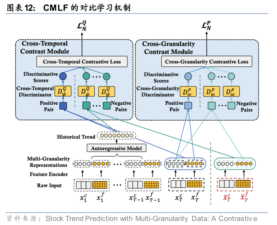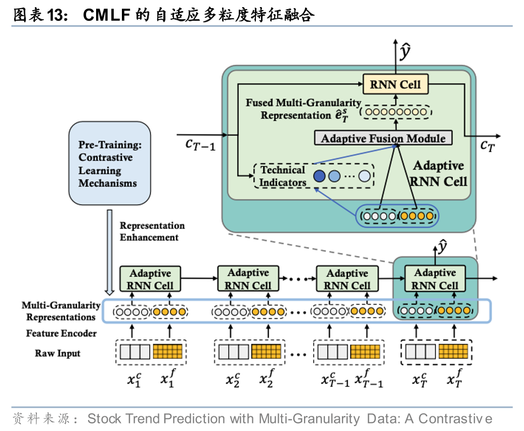 Hou等(2021)指出,直接融合不同粒度数据面临两大挑战:一是目标趋势与细粒度数据之间的粒度不一致性导致优化困难;二是金融市场状态持续变化,需要动态调整不同粒度信息的融合方式。为此,该研究提出多粒度对比学习框架(CMLF),在预训练阶段设计了跨粒度对比和跨时间对比两种机制,以学习更有效的股票表征;在特征融合阶段则引入自适应门控机制,动态调节不同粒度特征的融合权重。