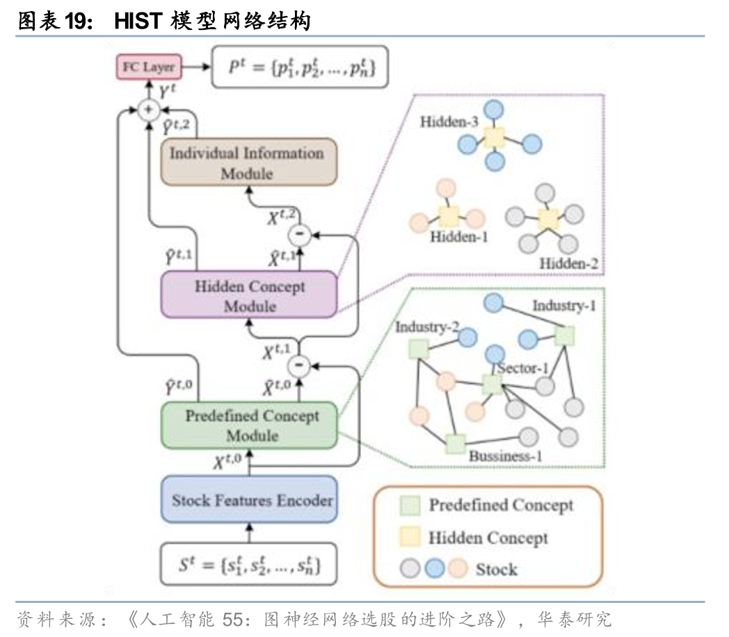 图神经网络(GNN)是多变量相关性建模的利器,华泰金工早期研究中对各类GNN模型在量化中的应用曾进行一定的探索。以HIST模型为例,在注意力机制的加持下,其通过多层残差图结构充分捕获单截面股票间显式的行业板块间关联收益、隐式的风格概念间关联收益以及剩余的股票特征性收益。