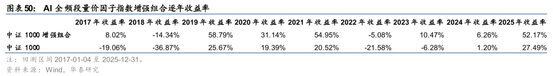自2017年初回测以来,该组合每年都稳定跑赢基准指数中证1000,年化超额收益率为21.86%,年化跟踪误差为6.05%,信息比率为3.62,超额收益最大回撤为7.55%,超额收益Calmar比率为2.89。在2024年初至今的样本外,超额仍能延续,其中2024年超额收益5.06%,2025年超额收益24.68%。