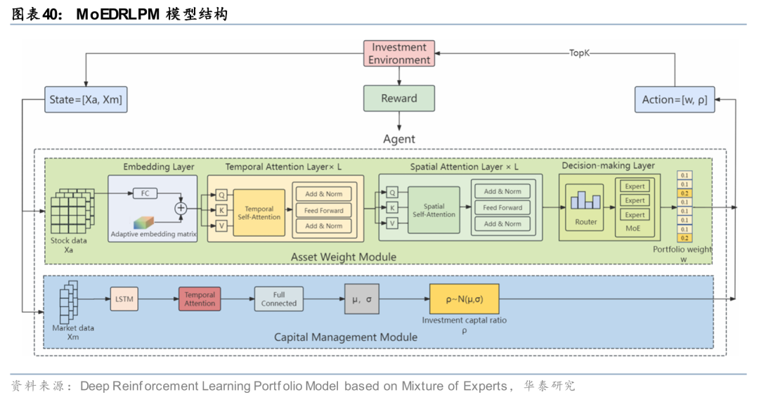 近期研究显示,强化学习在投资组合中的作用正在从简单的权重生成,向更具结构性的决策范式演进。Wei 等人(2025)提出的MoEDRLPM(Deep Reinforcement Learning Portfolio Model based on Mixture of Experts),通过引入时序与空间注意力机制刻画资产的时空相关性,并利用混合专家(Mixture of Experts)结构在不同市场状态下动态切换交易逻辑,从而避免单一策略在多变市场中的过度泛化。这表明强化学习不仅可以用于学习权重分配规则,还可以作为统一框架,融合市场风险识别、策略切换与资金管理等多个决策层面,在长期收益与风险控制上取得更稳定的表现。