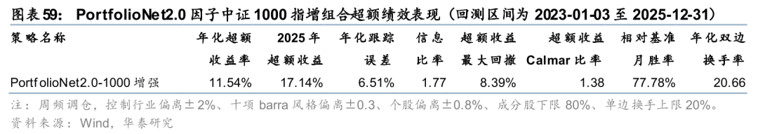 在此基础上,后续研报关注到端到端组合优化面临的另一问题——AIpha信号无法实现理想的风格剥离,Pure Alpha收益受到侵蚀。针对该问题,《PortfolioNet 2.0:如何兼取风格收益与 Pure Alpha》(20251216)在前期模型之上,对组合约束项赋予可微性能,让AI 量价因子追求较高收益弹性,捕捉 Pure Alpha 之外的风格收益。在回测区间2023-01-03至2025-11-28内,合成因子相比于经典AI量价模型取得明显提升,在300增强、500增强与1000增强场景下,年化超额收益分别提升7.5pct、7.5pct与8.5pct,信息比率同步改善。