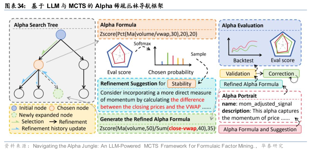 在大语言模型赋予因子挖掘认知能力的同时,如何在高维稀疏的Alpha丛林中高效导航,仍是一个巨大的挑战。传统的随机搜索或贪心策略容易迷失方向,而未来的挖掘引擎将更多融合蒙特卡洛树搜索(MCTS)等规划算法,通过构建决策树,算法能够前瞻性地评估每一步算子选择的长期价值,而非短视地追求当前收益。