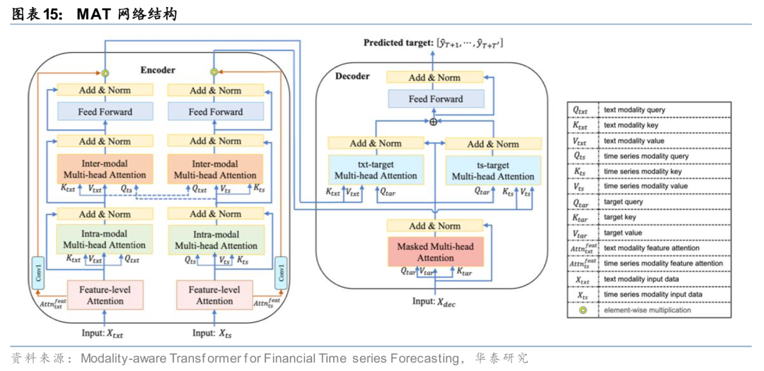 当前深度学习模型在挖掘跨模态交互信息方面仍存在局限。Gohari等(2024)提出的模态感知Transformer(MAT)模型,通过引入特征级注意力层来识别各模态中最相关的特征,并设计三种多头注意力机制:模态内注意力用于捕捉单个模态内部的时间依赖关系,模态间注意力用于探索不同模态之间的关联,目标模态注意力则在解码阶段用于捕捉目标序列与各输入模态间的交互作用。