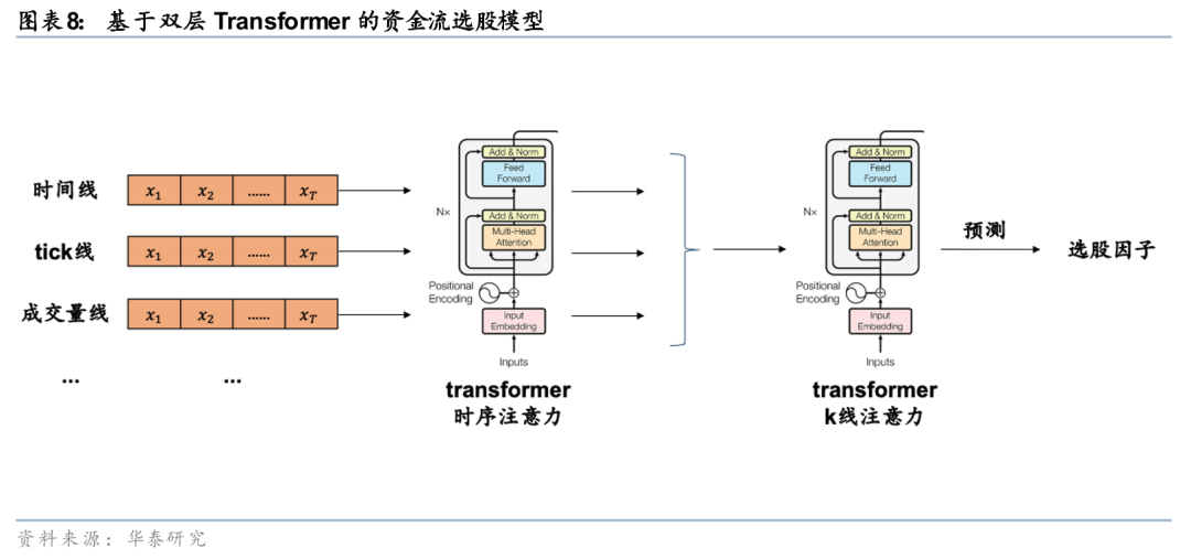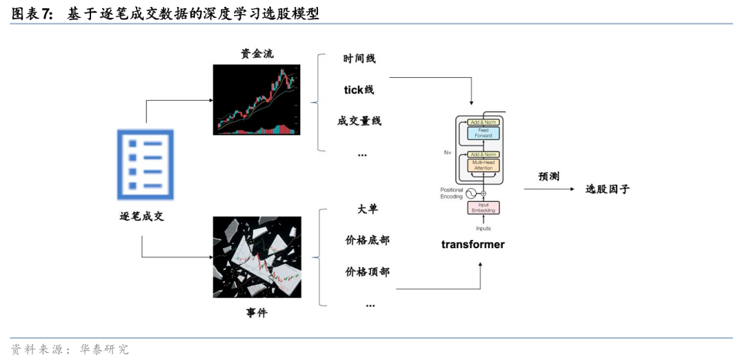在《人工智能93:基于逐笔成交的深度学习选股模型》(20250714)中,我们构建基于逐笔成交的深度学习选股模型。我们从资金流和事件驱动两个角度开展特征工程,并利用Transformer模型学习多维度的注意力规律,最后形成有效的选股因子。以资金流模型为例,首先分别根据等时间、等成交笔数、等成交量、等价格波动,对逐笔成交数据进行采样,提取价格、成交量、大小单和主动买卖信息,形成4种结构化的K线;接着构建双层Transformer模型,第一层学习时序注意力,第二层学习跨K线注意力,最终输出个股未来10日超额收益的预测。