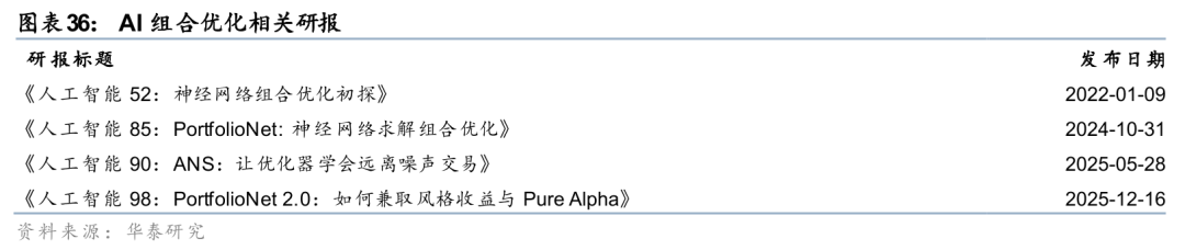 以上两项研究从不同角度推动了AI+组合优化的落地:前者着眼于打通预测与优化的断层,使模型直接对组合决策结果负责;后者则利用AI组合优化算法,巧妙地从原始Alpha信号中剥离出Pure Alpha组合,使模型兼取Pure Alpha与风格收益。相关方法与实验结果已在前期研报中作了更为系统的展开,本文仅作问题脉络与研究线索的简要梳理,以供参考。