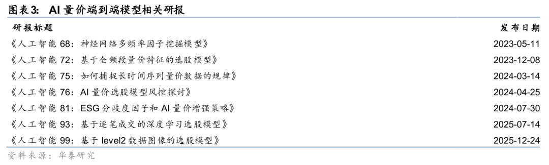 在量价研究普遍“内卷”的背景下,AI端到端建模并非仅是工程效率的提升手段,而是作为一种具备长期价值的研究范式。相较于依赖人工特征拆解、分阶段拼接的传统路径,端到端框架尝试直接面对市场原始数据,在统一的表示空间中学习价格、成交与微观结构间的内在联系。量价研究渐渐从局部经验驱动,迈向整体结构感知。