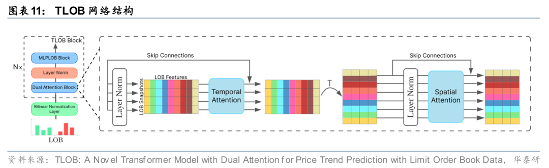 对于第一种思路,数据预处理和网络架构设计较为关键。以订单簿数据(LOB)为例,传统预处理通常采用前一日量价数据的均值和标准差对当日数据进行z-score标准化,Tran等(2020)提出双线性标准化(Biliner Normalization)方式,使模型能够自适应地学习标准化参数,从而缓解数据非平稳分布问题。在模型设计方面,Zhang等(2020)提出的经典DeepLOB模型,利用CNN捕捉价量、买卖方及档位间交互信息,并借助LSTM建模时序依赖关系;而Berti等(2025)设计的TLOB模型,通过双层Transformer同时学习时序和特征间的注意力机制,显著提升对价格趋势的预测能力。