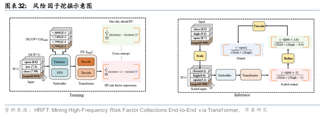 近期已有研究尝试将Transformer引入风险因子挖掘(Xu et al., 2025),HRFT(High-Frequency Risk Factor Transformer)作为一种端到端的挖掘框架,将符号数学类比为语言,利用Transformer强大的序列建模能力,直接从高频交易特征中自动提取可解释的公式化风险因子。该模型通过混合词表同步预测因子逻辑与常数,能够精准度量短期市场收益分布的方差,从而捕捉传统方法难以刻画的非线性波动规律。