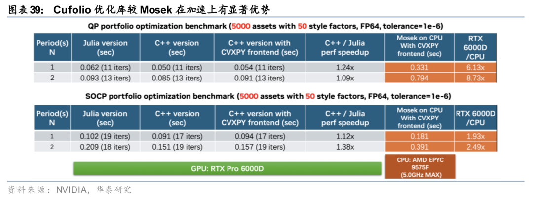 近年来,研究和工程实践开始关注组合优化求解器的加速,在并行化实现、GPU原生计算以及结构化矩阵运算等方向已取得多项可落地的技术成果。例如英伟达推出的cuFolio组合优化库,尝试将经典组合优化问题映射至GPU架构下高效求解,为大规模、多约束组合优化提供了可行的工程化加速路径。这类底层算力与算法实现的进展,为组合模型在实际投资场景中的应用打开了新的空间。