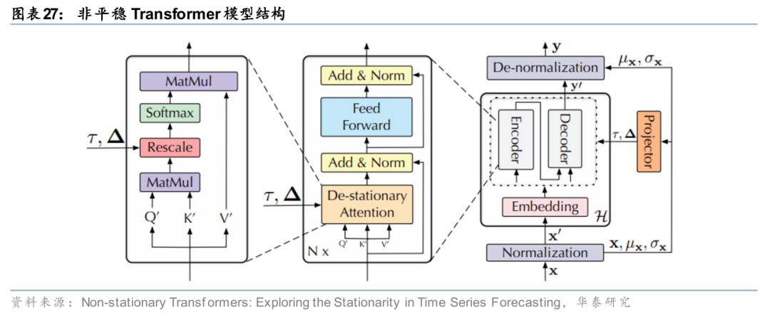 思路一:针对数据分布的自适应调整。训练AI模型时的常规步骤是对输入数据进行标准化预处理,如在时序维度作Z-Score标准化或均值中心化,其实已将时间序列中的非平稳信息过滤,或将丢失一部分关键信息,例如股价波动水平、股价历史分位数等。因此Liu等(2022)对Transformer的底层架构进行改造,首先保留数据预处理时描述原始数据分布特征的参数(如均值、方差等),再将注意力机制中计算的自注意力权重按照从原始数据分布特征中学习得到的平稳因子进行放缩,将数据分布的统计特征引入注意力特征提取模块中,从而使模型能感知到数据分布的变化。