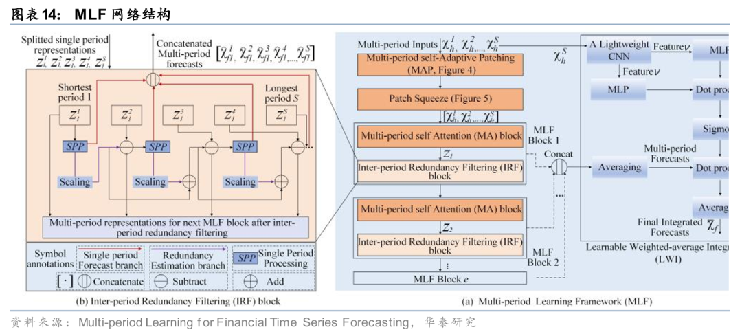Zhang等(2025)设计的多周期学习框架(MLF)包含三个核心模块:周期间冗余过滤(IRF),用于消除不同周期间的冗余信息;可学习加权集成(LWI),用于融合各周期的预测结果;多周期自适应分块(MAP),确保各周期的数据块数量一致,以降低模型偏差。