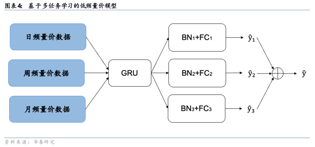2023年5月,我们在《人工智能68:神经网络多频率因子挖掘模型》(20230511)中利用神经网络自动提取股票原始量价数据中的特征,实现端到端的因子挖掘和因子合成,成为AI量价端到端模型的开篇之作。其后,我们进一步基于多任务学习的低频量价模型,使得模型同时接收日频、周频和月频三种不同颗粒度的K线数据,采用同一个GRU模块提取时序信息、实现知识共享,从而提升合成信号的效果。