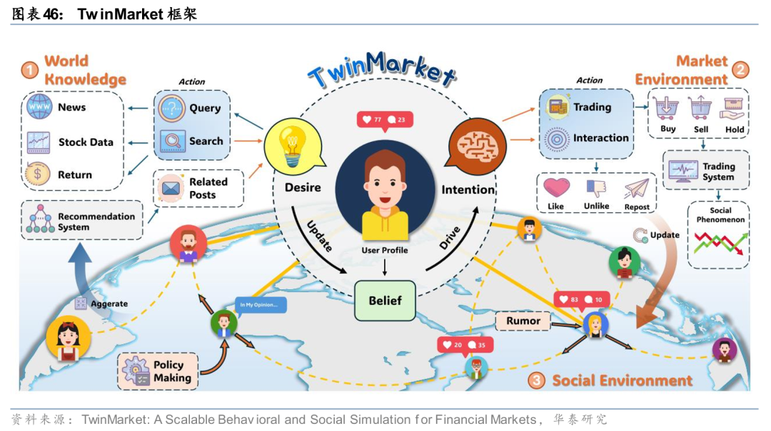 基于主体/智能体的建模(Agent-Based Modeling,ABM)通过模拟大量异质性个体(如消费者、银行、企业等)在特定规则下的交互,来观察宏观系统如何产生复杂的现象。TwinMarket(Yang等,2025)是一个通过融合信念-欲望-意图认知架构与动态社交网络交互,模拟金融市场中个体行为如何涌现出宏观复杂结构的多智能体框架。该框架能够复现多种金融“风格化事实”,例如资产收益的肥尾分布、波动率聚集、杠杆效应以及成交量与收益率的关系,实现对宏观市场结构与资产价格动态的可解释、可扩展建模。