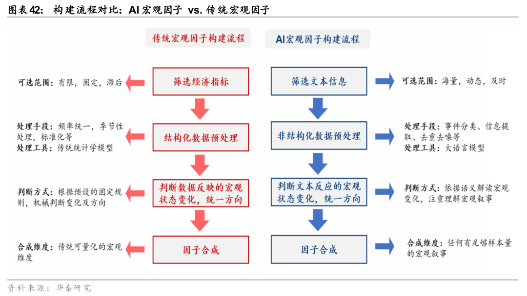 传统宏观量化研究的痛点在于,受限于样本量和结构化数据建模的局限性,往往依赖线性模型刻画宏观与资产关系,虽易于解释却牺牲了真实世界的复杂性。如今,大模型等AI技术突破了数据规模与建模能力的双重限制:既能处理海量非结构化文本,拓宽信息边界、提高样本频率;也能借助“硅基智能体”仿真框架,刻画多主体间的非线性互动与动态反馈。