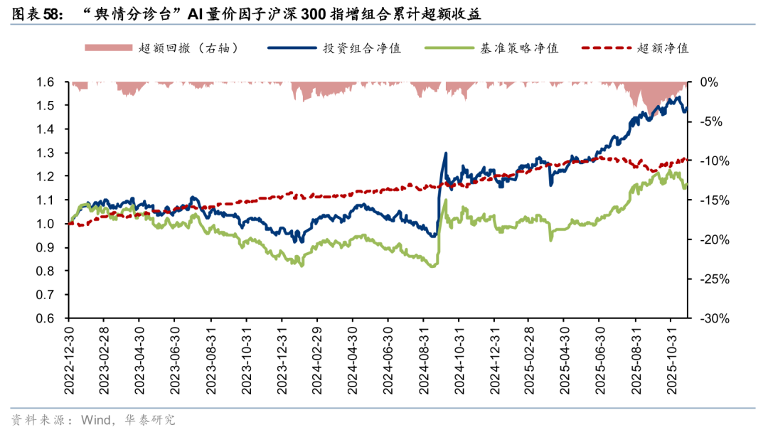 舆情分诊台因子在25Q3同样经历了一定超额回撤,目前跌幅已基本修复。未来,对“乐观域”加强动量效应学习,或有望改善“机构抱团”行情期间的策略回撤情况。