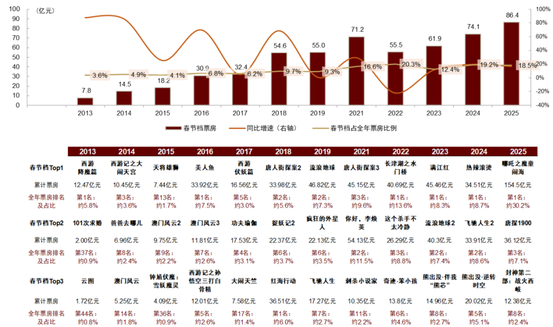 自2013年《西游降魔篇》档期内票房超5亿元、标志春节档诞生以来,春节档含服务费票房已从2013年的8亿元左右攀升至2025年95亿元左右,扩容近10倍,档期重要性凸显。