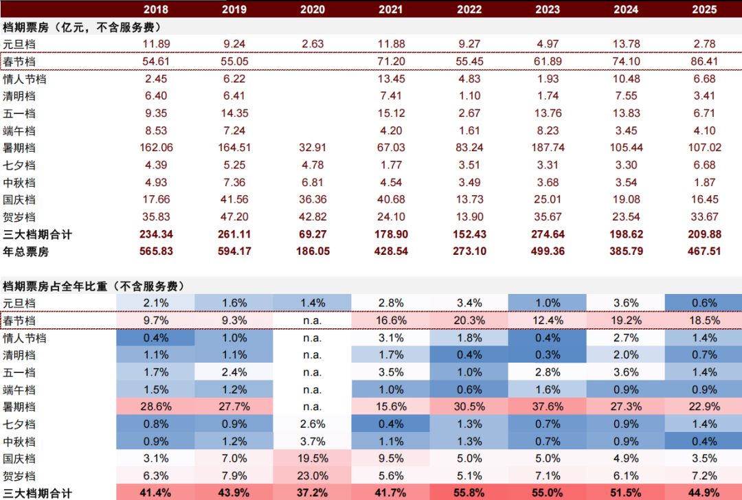 注:统计截至2026年1月28日;三大档期指春节档、暑期档、国庆档;票房均不含服务费;自2022年起艺恩不披露贺岁档,数据为该年度12月份的票房合计;n.a.表示数据源缺失