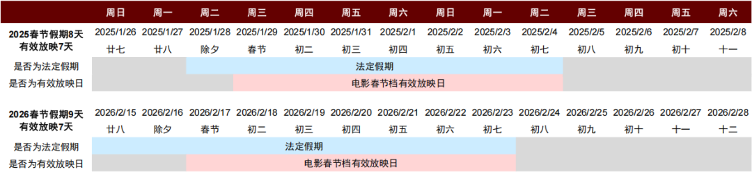 注:统计截至2026年1月28日,蓝色块表示为法定假期,红色块表示为电影春节档有效放映日,灰色表示为其他