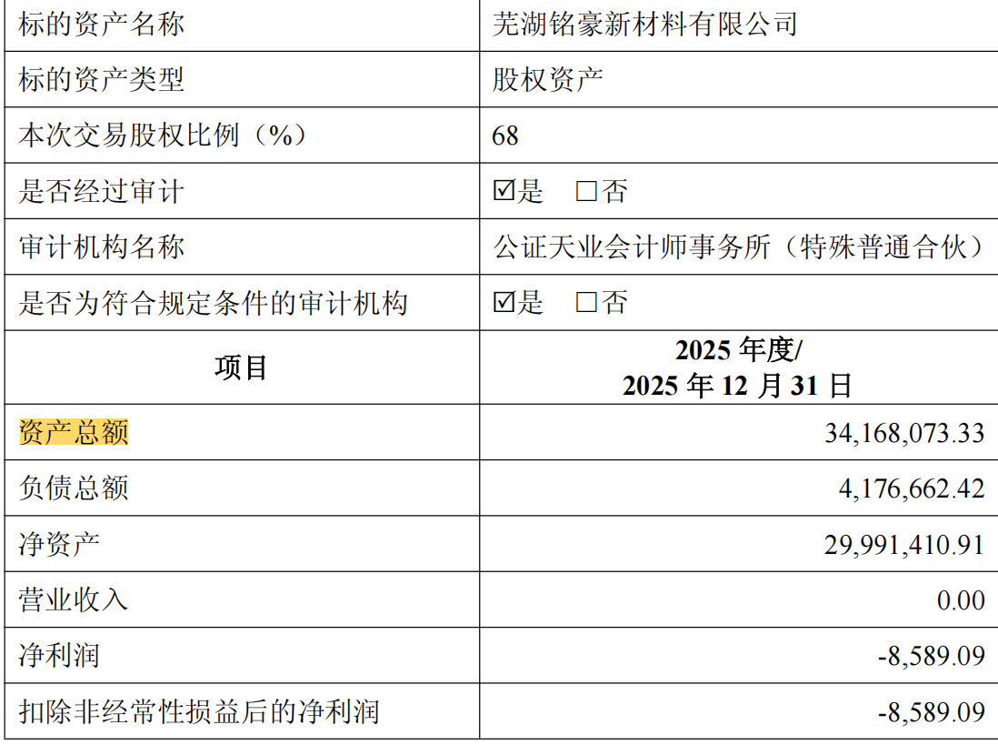 相较于安徽嘉奇,芜湖铭豪的财务状况更为堪忧。审计报告显示,该公司2025年度营业收入为0元,净利润处于亏损状态。