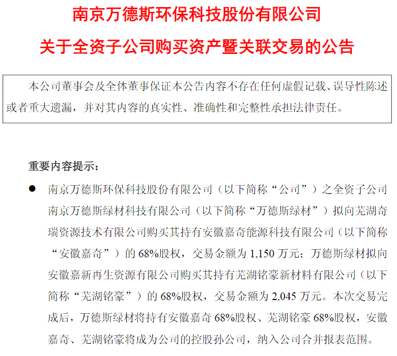3月3日,万德斯发布公告,拟向芜湖奇瑞资源技术有限公司购买其持有安徽嘉奇能源科技有限公司(以下简称安徽嘉奇)68%股权,向安徽嘉新再生资源有限公司购买其持有芜湖铭豪新材料有限公司(以下称芜湖铭豪)的68%股权,交易金额合计3195万元,涉足电池回收和汽车拆解业务。