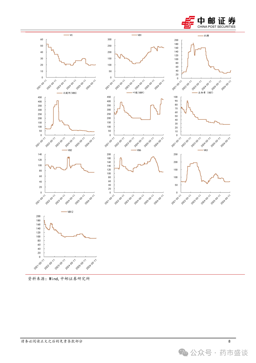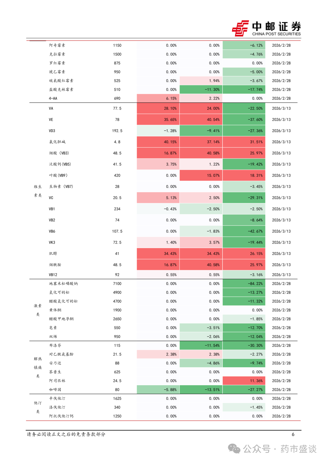 1、 原料药:维生素多品种开启涨价,其中VE、烟酸(VB3)、叶酸(VB9)等品种已率先启动,本周以来VA价格开启拉升,泛酸钙主流厂家本周也已停报停签,价格走势有所抬头,后续有望跟涨。