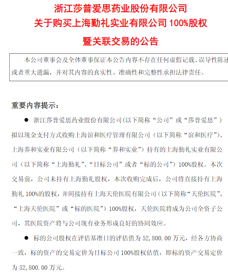 此次交易完成后,上海勤礼将成为莎普爱思的全资子公司,纳入合并报表范围。上海勤礼全资子公司天伦医院是按照全科医院标准创建,集医疗、预防、保健为一体的现代化综合医院,科室齐全,盈利能力突出。莎普爱思将根据天伦医院的优势进行资源整合,同时导入公司优秀的管理模式,实现公司与标的医院之间资源共享和优势互补。