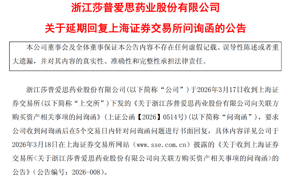 上述交易也引起了交易所的关注,2026年3月17日,莎普爱思收到上交所下发的《关于浙江莎普爱思药业股份有限公司向关联方购买资产相关事项的问询函》,要求公司收到问询函后在5个交易日内针对问询函问题进行书面回复。