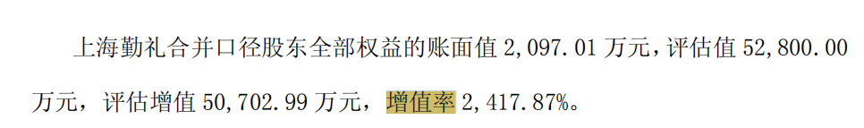 公告显示,此次溢价率高达24倍。即上海勤礼净资产账面价值为2097.46万元,而评估值则达到5.28亿元,增值率高达2417.87%。