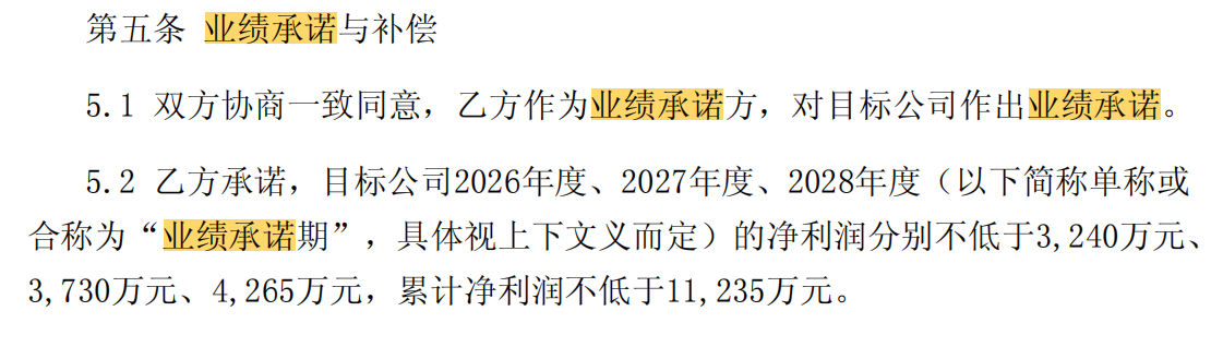 此次并购的业绩承诺是,上海勤礼2026年至2028年的净利润将分别不低于3240万元、3730万元和4265万元,三年累计不低于1.12亿元,业绩承诺相比2024年、2025年明显增长。