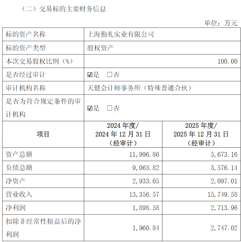 此次并购的标的资产上海勤礼实业成立于2022年,法定代表人为林弘立,2024年至2025年,该公司分别实现营业收入1.34亿元、1.57亿元,对应净利润1898.58万元、2713.96万元。