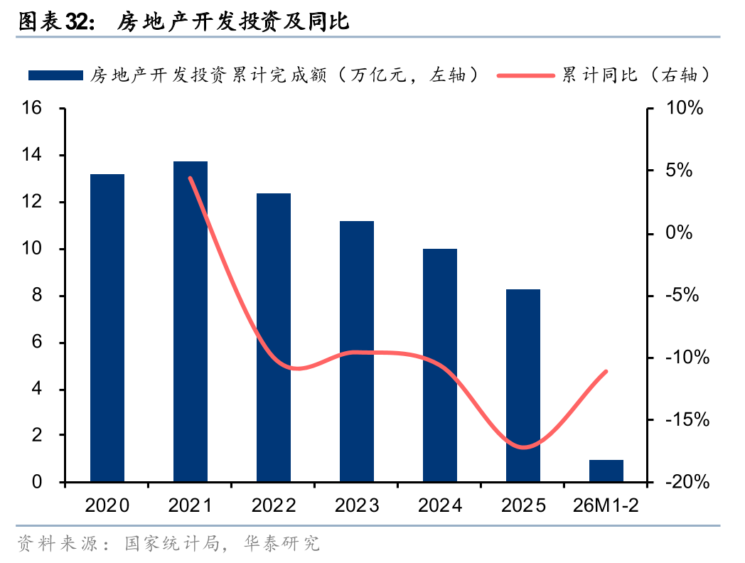 另外根据 2026 年《政府工作报告》、中央经济工作会议等精神,“着力稳定房地产市场”中“控增量”依然是核心思路之一,结合近期自然资源部38号文发布,我国从源头控制房地产增量供给预计会持续较长时间。今年以来的统计局数据也在体现这点:1-2月开发投资同比-11%,新开工同比-23%,降幅较2025年12月扩大4pct。我们认为房地产市场价格跌幅收窄再到投资重启仍需要一段时间等待,在此之前由于存量交易量会更快复苏,我们预计更利好地产链偏中后端的地产链,如存量房交易、装修、家居、家电等。