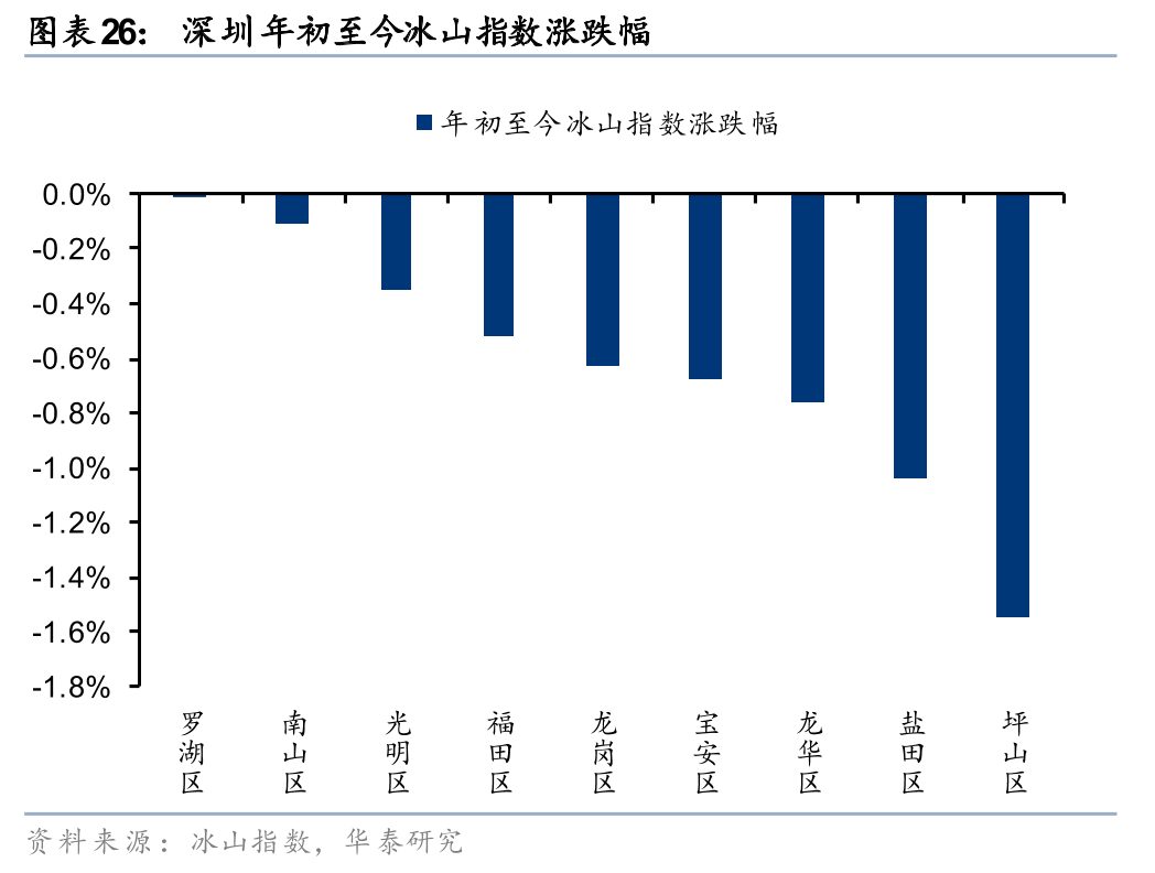 我们观察到除上海房价指数出现回稳外,廊坊、丹东、北海等偏低能级城市冰山指数亦出现一定的回稳迹象。前述4个城市今年以来累计涨幅达0.6%/0.4%/0.2%/0.2%。以半年为维度,跌幅相对较小的城市集中在低能级城市,如北海、丹东、太原、开封、哈尔滨、洛阳、沈阳等,半年房价指数跌幅在3%以内。这点和我们在年度策略《把握周期机遇,迈向价值导向》(2025年11月3日)中判断一致,房价呈现哑铃型分化走势,即调整时间较长和调整幅度较深的低单价城市,以及高能级城市韧性更为突出,有望在今年率先企稳。