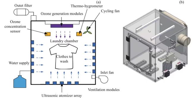 清洗过程中,洗衣机首先将 400 毫升的水超声波雾化成超细水雾,打满衣物;随后通过紫外线产生臭氧,对衣物进行杀菌;最后利用热空气分解残余臭氧,同时烘干衣物。