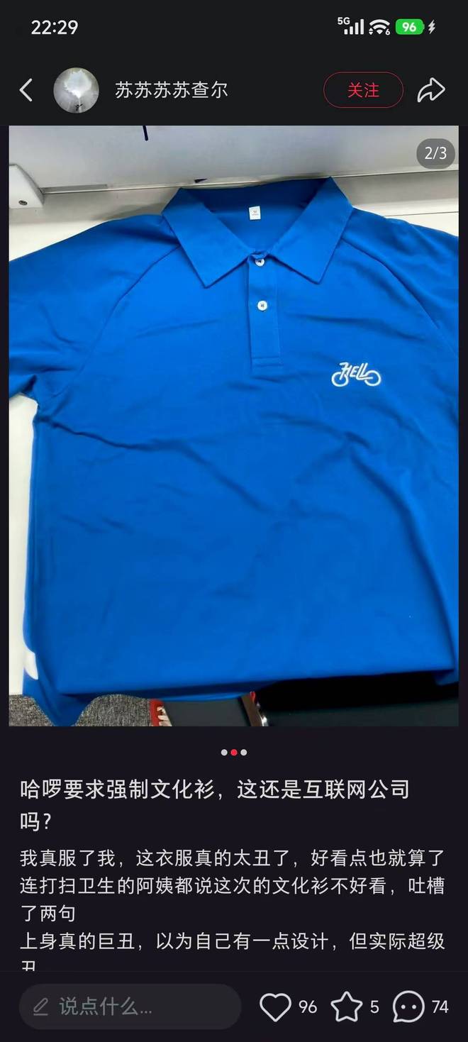 据悉,哈啰有员工在社交平台发帖称,哈啰强制穿文化衫,吐槽这件文化衫「真的太丑了」,连打扫卫生的阿姨都说不好看。从其公布的图片显示,文化衫全身为蓝色,印有哈啰标志及白色条状印记,上身效果不佳。