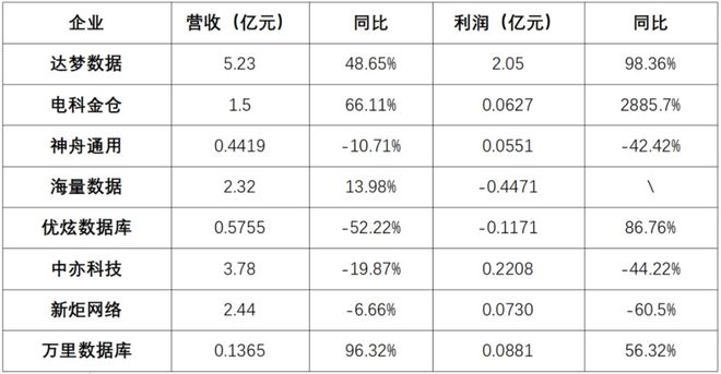 (达梦数据库年报(亿元),来源:百度股市通)其他的国产数据库厂家,比如中亦科技、海量数据、新炬网络等,其2025年半年报数据显示,最高的不过3.78亿元,低者只有1365万元,利润过千万的仅有中亦科技。营收和利润同比增加的仅有电科金仓、海量数据、万里数据库等几家。
