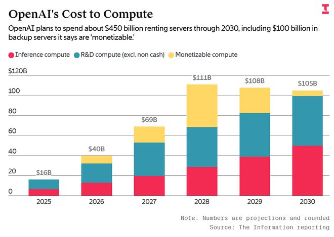 据高管预测,OpenAI的备用服务器开支将在2028年达到峰值400亿美元。为何之后大幅下降尚不明确,但公司已表示最终将自建数据中心和芯片,可能由此填补缺口。