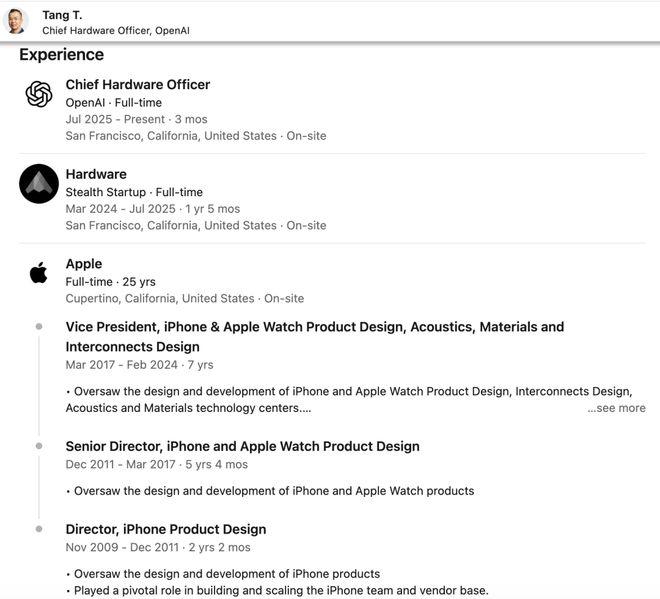 对LinkedIn数据的分析显示,2025年已有超过二十名苹果消费硬件工作人员加入OpenAI。