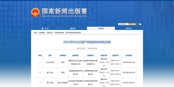 昨天晚间,国家新闻出版署公布了 2025 年 9 月国产及进口网络游戏审批结果,共有 156 款产品获批,其中国产网络游戏 145 款,进口网络游戏 11 款。