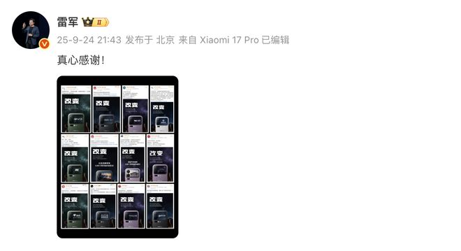 该动态发布后不久,小米集团创始人雷军在评论区回应:「真心感谢!」引发网友热议。