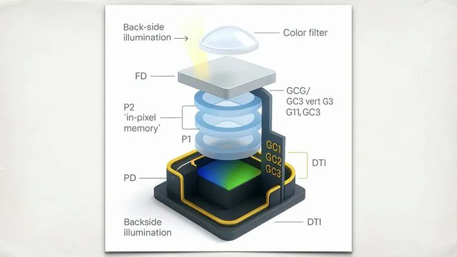 专利描述中提到,每个像素内部将包含一个垂直堆叠的「缓冲区」,可在曝光瞬间同时存储光线信息,再逐行读取生成图像。相比传统横向设计,苹果的垂直堆叠方案能够节省更多采光空间,并减少杂散光干扰。