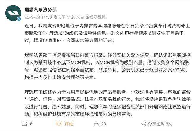 理想法务部:发布「i6」虚假信息,涉事 MCN 已被处罚