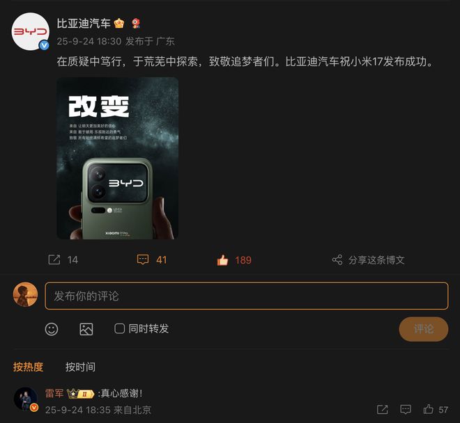 比亚迪汽车今日在官方微博发文,祝小米 17 发布成功。