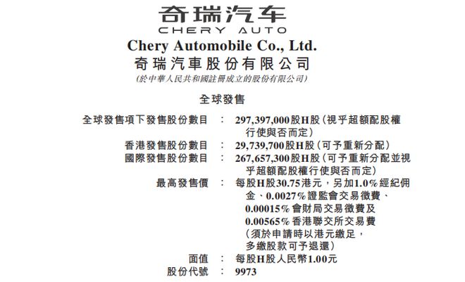 9月25日,奇瑞汽车股份有限公司在港交所正式挂牌上市,本次IPO共发售约2.97亿H股,以30.75港元/股的招股价上限定价。