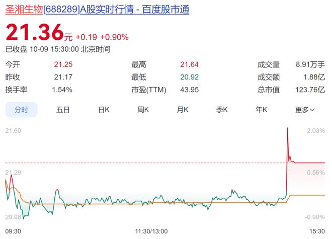 市场方面,圣湘生物今日报收21.36元/股,上涨0.9%,最新市值123.76亿元。